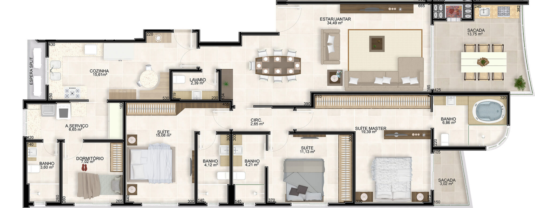 3 suítes, sendo uma com sacada – privacidade e amplitude para toda a família
