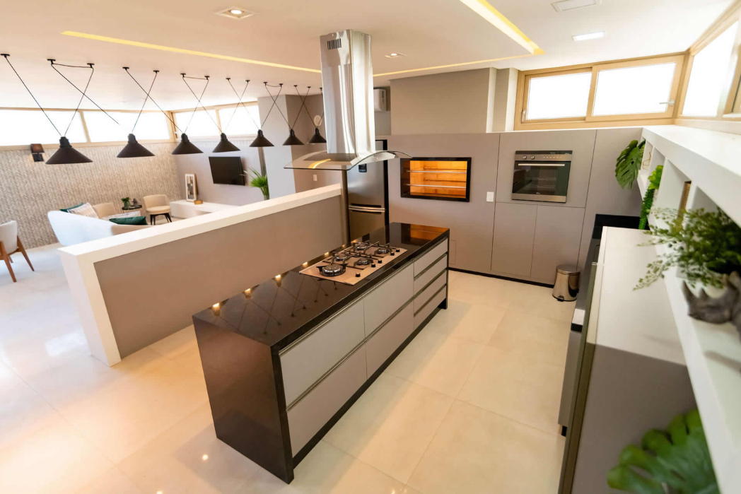 Sala de estar e jantar integradas à cozinha – ambiente social fluido e elegante