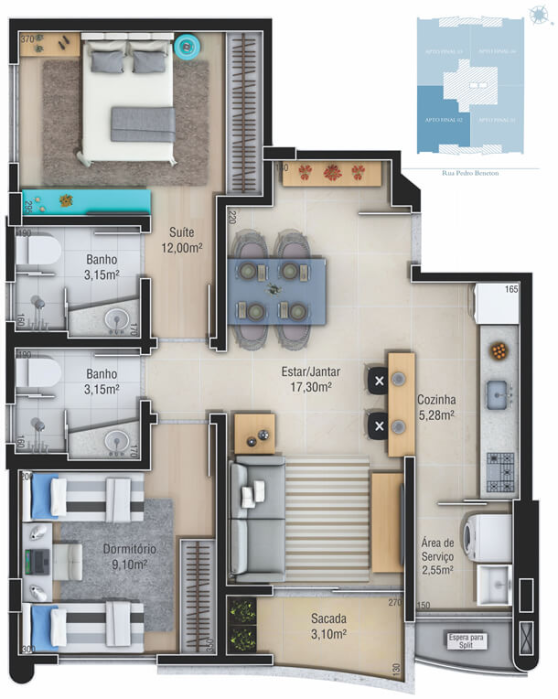 2 dormitórios, sendo 1 suíte – planta bem distribuída para viver com conforto
